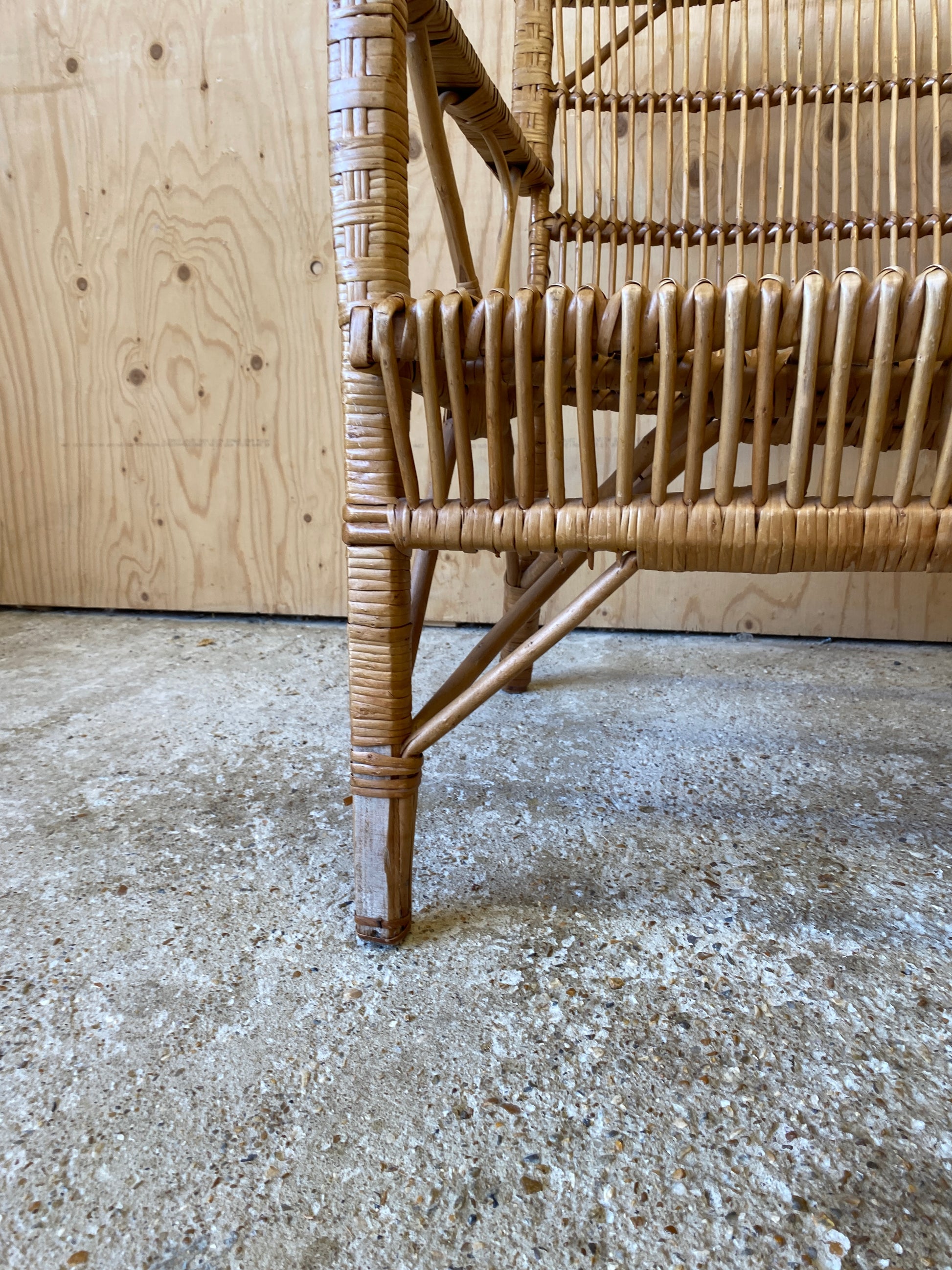 This bamboo/wicker bench has been carefully cleaned, but may still show signs of age and use. Some areas of the wicker may have perished, as shown in photos, but the chair remains sturdy.