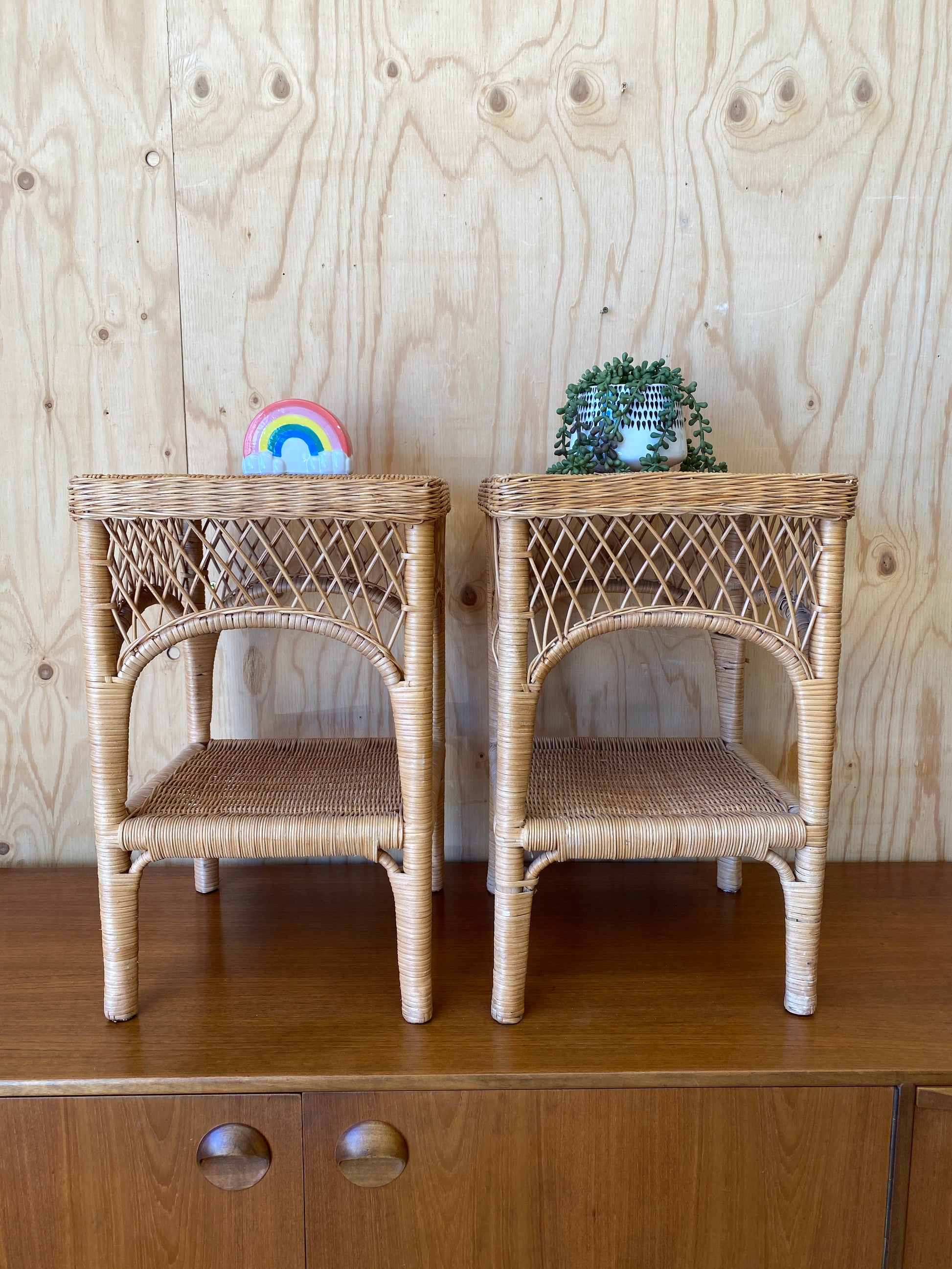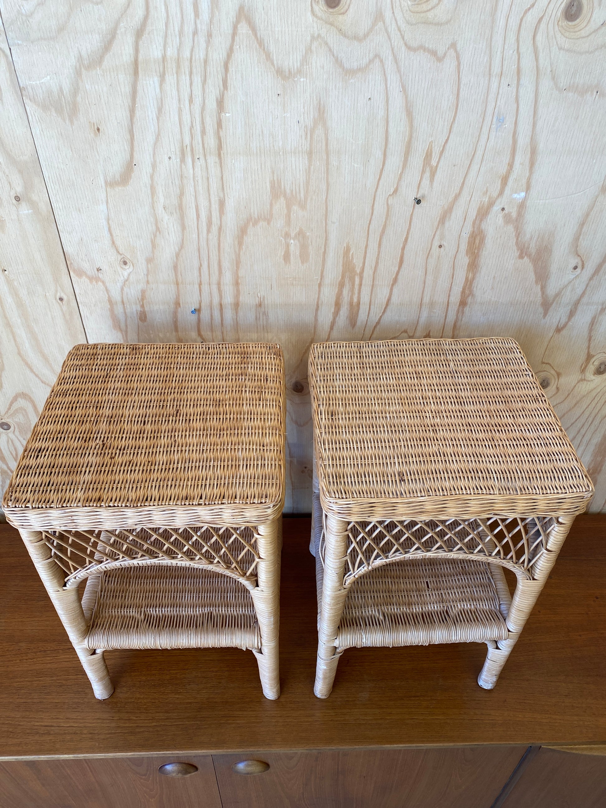 A beautiful pair of wicker bedside tables, both with a small shelve.
