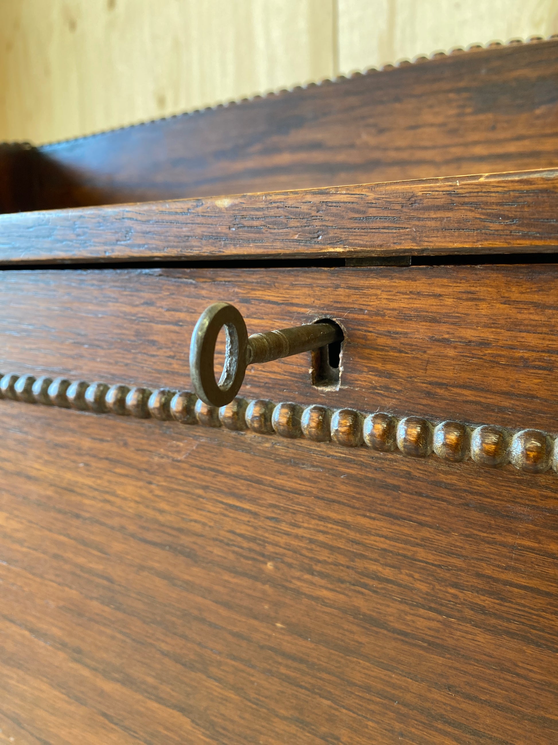 This vintage piece has been cleaned; however, like many items from this era, it may exhibit signs of wear, adding character to its charm. The top may be missing some detailing, and there are a few marks on the bureau, so it is encouraged to review the photos for further inspection.