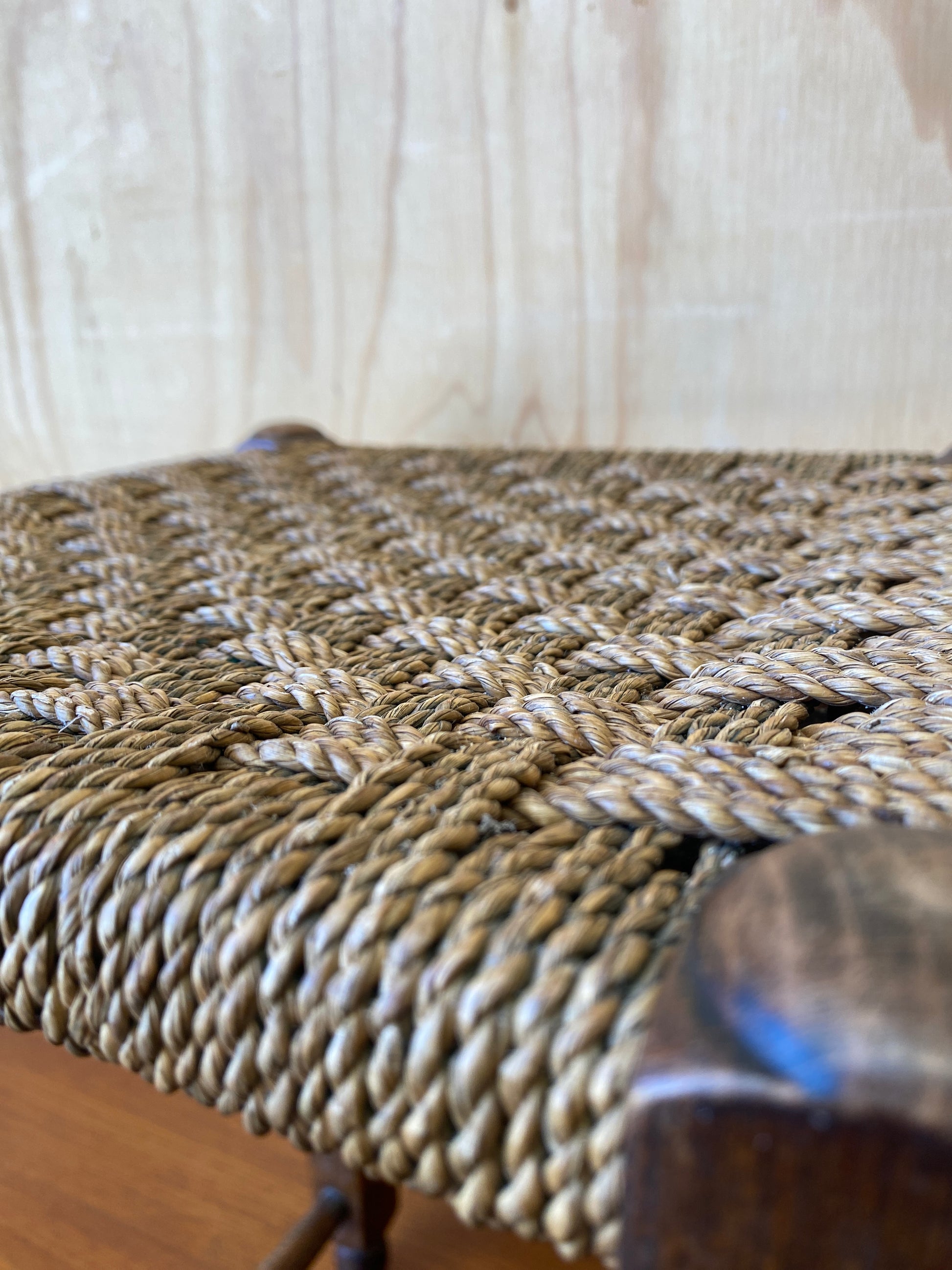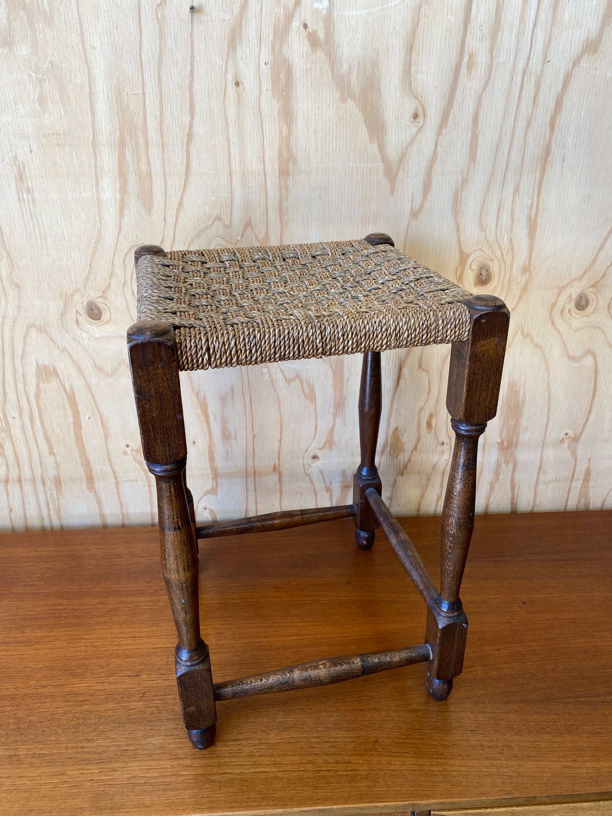 A lovely square tall woven wooden stool with turned legs.